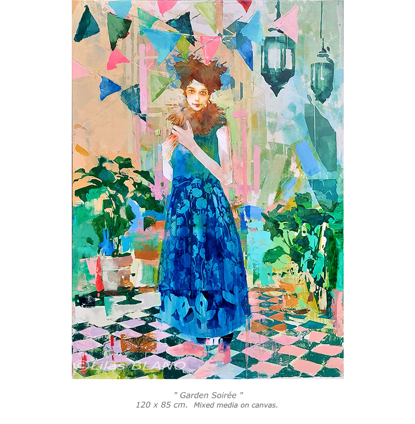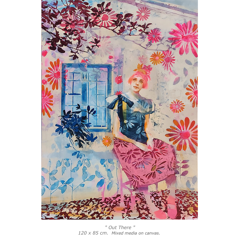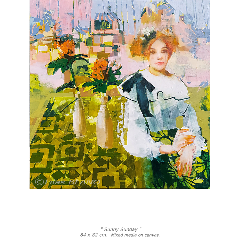Today, she is evolving toward a new artistic expression, exploring synthetic and geometric rhythms, and new color harmonies, creating modern symphonies where her young women blend into deconstructed environments, always infused with light and femininity.